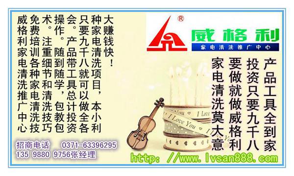 如果你想創(chuàng)業(yè),又找不到投資方向,請(qǐng)聯(lián)系我們。如果你在做家電制冷維修,那么家電清洗無(wú)疑使你多了一項(xiàng)增值項(xiàng)目。如果你做著家政保潔,那么在不增加人力的情況下加一項(xiàng)清洗項(xiàng)目,多一份收益,何樂(lè)而不為呢。如果你是在銷(xiāo)售家用電器,還要為售后服務(wù)不完善發(fā)愁嗎,家電清洗服務(wù)是不錯(cuò)的選擇。